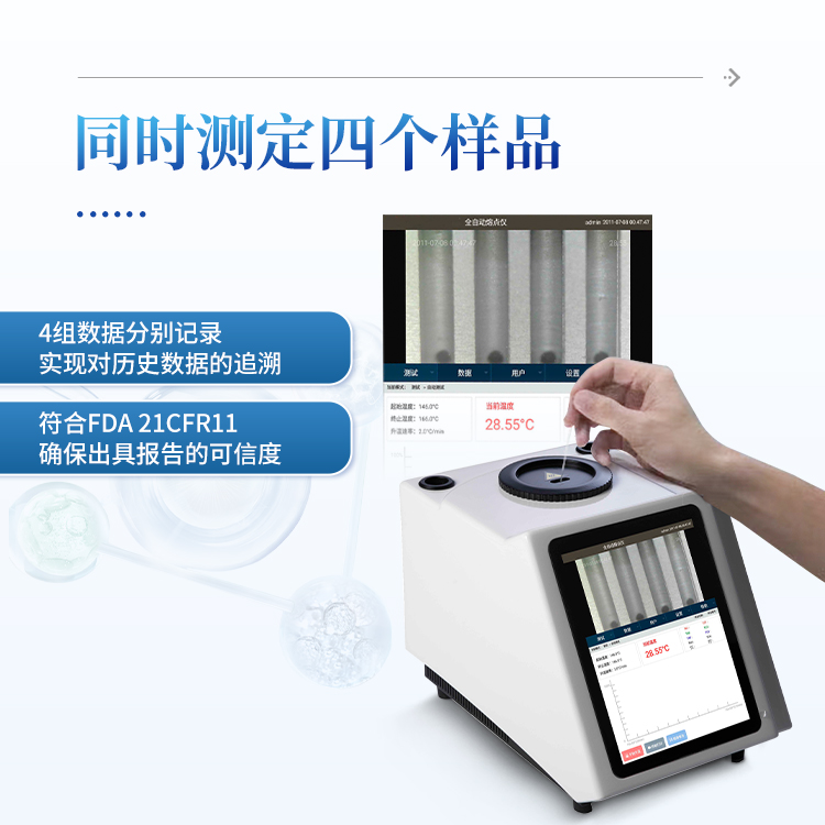 简要描述: 全自动视频熔点仪自动化集成,实现一键测定功能;一次处理4个样品;高清视频代替传统显微镜 目视高;全自动记录熔程,初熔,终熔;可通过打印机直接打印数据。可同时测定四个样品:升温一次最多放置4个样品,与传统测量方法相比工作效率提高4倍,且4组数据分别记录实现对历史数据的追溯,符合FDA 21CFR11确保出具报告的可信度。